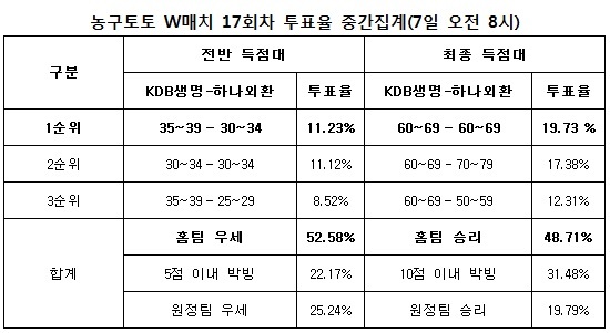 [농구토토] 국민체육진흥공단(www.kspo.or.kr)이 발행하는 체육진흥투표권 수탁사업자인 스포츠토토 공식 온라인 발매사이트인 베트맨(www.betman.co.kr)이 오는 8일 오후 5시 구리시체육관에서 벌어지는 KDB생명-하나외환 전 대상 농구토토 W매치 17회차 투표율을 중간 집계한 결과, 참가자의 48.71%는 KDB생명이 하나외환에 승리를 거둘 것으로 예상했다고 밝혔다.