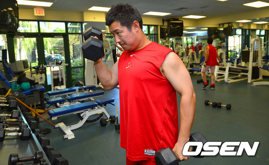 SK 안치용이 덤벨로 웨이트 훈련하고 있다