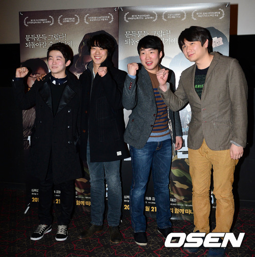[OSEN = 백승철 기자] 7일 오후 서울 행당동 CGV 왕십리에서 열린 영화 '1999, 면회' 언론배급시사회에서 (왼쪽부터)김창환, 심희섭, 안재홍, 김태곤 감독이 포토타임을 갖고 있다.