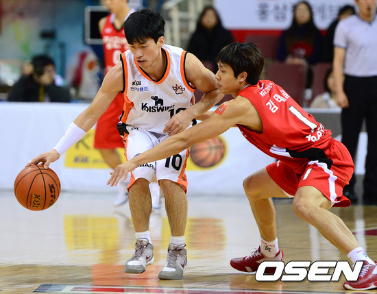 7일 오후 안양실내체육관에서 열린 '2012-2013시즌 KB국민카드 프로농구' 안양 KGC인삼공사와 인천 전자랜드의 경기, 1쿼터 KGC 김태술이 전자랜드 이현민의 볼을 뺏으려 손을 뻗고 있다.