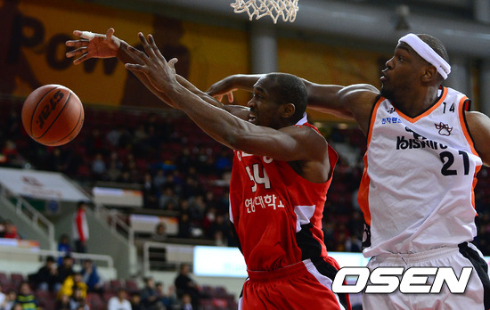 7일 오후 안양실내체육관에서 열린 '2012-2013시즌 KB국민카드 프로농구' 안양 KGC인삼공사와 인천 전자랜드의 경기, 2쿼터 KGC 키브웨와 전자랜드 카스토가 리바운드 다툼을 하고 있다.