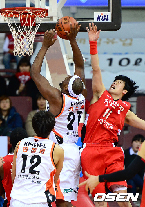 7일 오후 안양실내체육관에서 열린 '2012-2013시즌 KB국민카드 프로농구' 안양 KGC인삼공사와 인천 전자랜드의 경기, 2쿼터 KGC 양희종이 전자랜드 카스토의 슛을 막고 있다.