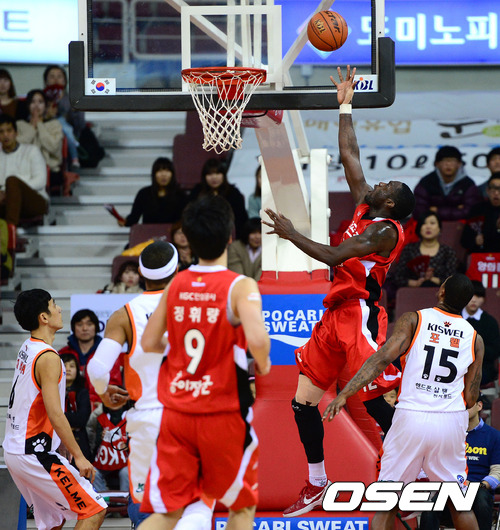 7일 오후 안양실내체육관에서 열린 '2012-2013시즌 KB국민카드 프로농구' 안양 KGC인삼공사와 인천 전자랜드의 경기, 3쿼터 KGC 파틸로가 전자랜드 수비진을 돌파한 후 레이업슛을 성공시키고 있다.