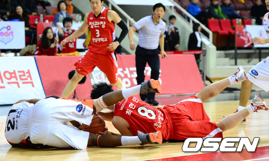 7일 오후 안양실내체육관에서 열린 '2012-2013시즌 KB국민카드 프로농구' 안양 KGC인삼공사와 인천 전자랜드의 경기, 4쿼터 젅자랜드 카스토와 KGC 최현민이 루즈볼 다툼을 하고 있다.