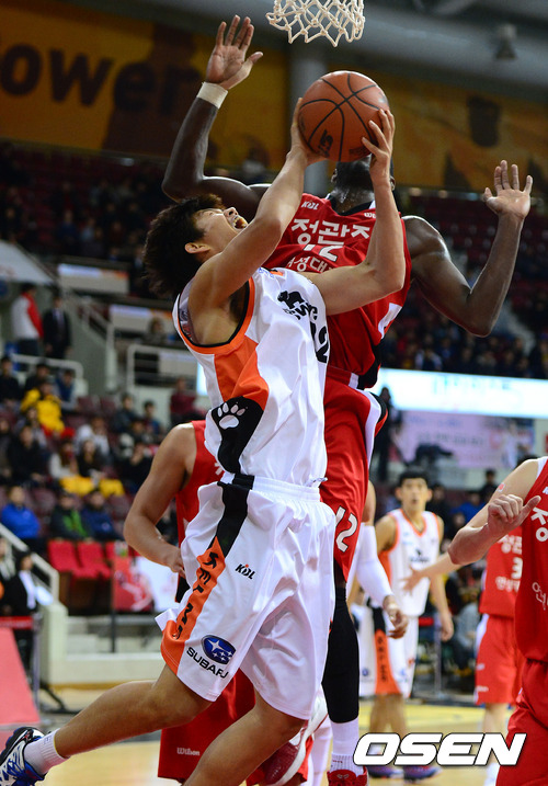 4쿼터 전자랜드 한정원이 KGC 파틸로와 충돌하고 있다./sunday@osen.co.kr