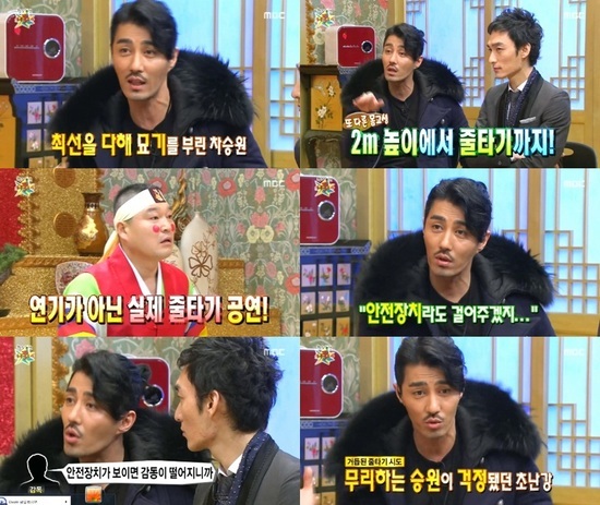 차승원은 7일 오후 방송된 MBC 예능프로그램 '황금어장-무릎팍도사(이하 '무릎팍')'에서 "연극에서 실제로 줄타기를 했다"고 밝혔다.