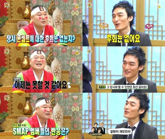 초난강은 7일 오후 방송된 MBC 예능프로그램 '황금어장-무릎팍도사(이하 '무릎팍')'에서 코믹 콘셉트에 대한 질문에 "후회는 없다"고 말했다.