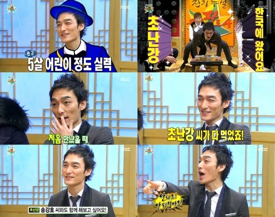 이날 방송에서 초난강은 등장부터 남달랐다. MC들의 춤을 보며 살짝살짝 몸을 흔들던 그는 MC 강호동의 요청에 두말없이 탁자 위에 물구나무를 서는가 하면 묘기를 부리며 "초난강, 한국에 왔어요"라고 외치는 등 몸개그를 선보여 웃음을 선사했다.