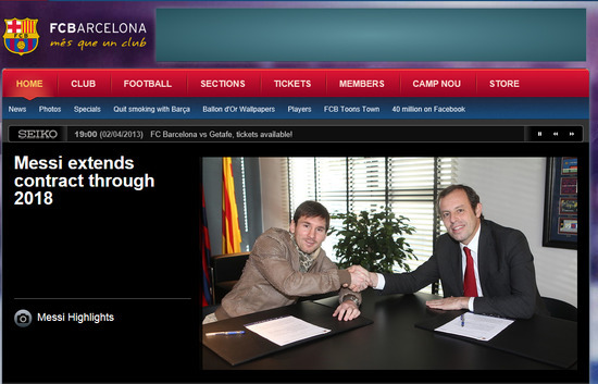 바르셀로나가 메시와 재계약을 맺었다. 무려 5년 5개월의 장기계약이다. 8일(이하 한국시간) 바르셀로나는 공식 홈페이지를 통해 "메시와 계약을 2018년까지 연장했다"고 발표했다. 계약만료 시기는 2018년 6월 30일이다. 메시는 이번 계약연장으로 만 31세까지 바르셀로나서 뛰게 됐다.