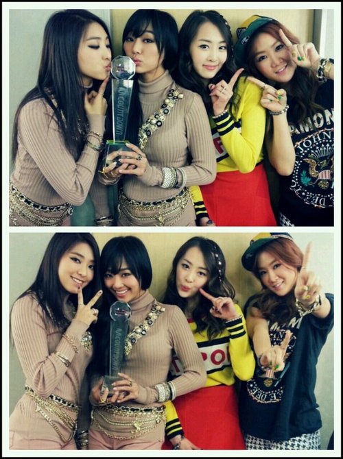 공개된 사진에는 섹시한 무대의상을 입은 보라와 효린이 케이블채널 엠넷 ‘엠카운트다운’에서 받은 1위 트로피에 뽀뽀를 하는 모습이 담겨있다. 멤버 소유와 다솜도 두 사람 옆에서 함께 1위를 축하하고 있어 눈길을 끈다.