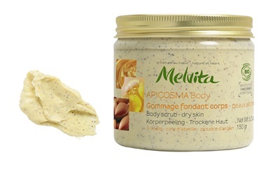 ‘아피코스마 바디 스크럽’ 은 멜비타에서 특허 출원 중인 3허니 복합체(백리향 꿀, 아카시아 꿀, 오렌지 블라썸 꿀)와 아르간 넛트 파우더가 함유돼 있어 부드럽게 각질을 제거해 준다. 또한 비 왁스 성분과 시어버터가 함유되어 매우 건조한 피부도 사용할 수 있는 것이 특징이다.