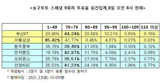 국내 프로농구(KBL) 3경기 대상 농구토토 스페셜 9회차 투표율 중간집계 결과