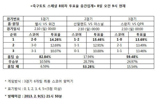 국민체육진흥공단(www.kspo.or.kr)이 발행하는 체육진흥투표권 수탁사업자인 스포츠토토 공식 온라인 발매 사이트인 베트맨(www.betman.co.kr)은 10일 펼쳐지는 잉글랜드 프리미어리그 첼시-위건(1경기), 선덜랜드-아스널(2경기), 스완지-QPR(3경기)전 등 EPL 3경기를 대상으로 한 축구토토 스페셜 8회차 투표율 중간집계 결과, 축구팬 14.26%가 1경기 첼시-위건전에서 첼시의 2-0 승리를 점쳤다고 밝혔다.