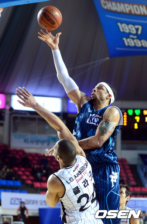 8일 오후 전주 실내체육관에서 열린 'KB 국민카드 2012-2013 프로농구' 전주 KCC와 창원 LG의 경기 1쿼터 브라운이 클라크를 앞에두고 슛을 시도하고 있다.