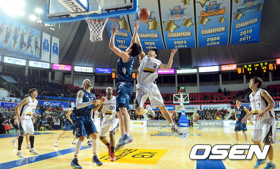 8일 오후 전주 실내체육관에서 열린 'KB 국민카드 2012-2013 프로농구' 전주 KCC와 창원 LG의 경기 2쿼터 정희재와 박진수가 리바운드 다툼을 하고 있다.