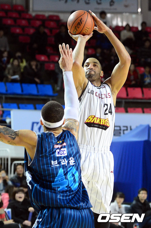 8일 오후 전주 실내체육관에서 열린 'KB 국민카드 2012-2013 프로농구' 전주 KCC와 창원 LG의 경기 3쿼터 클라크가 외곽슛을 시도하고 있다.