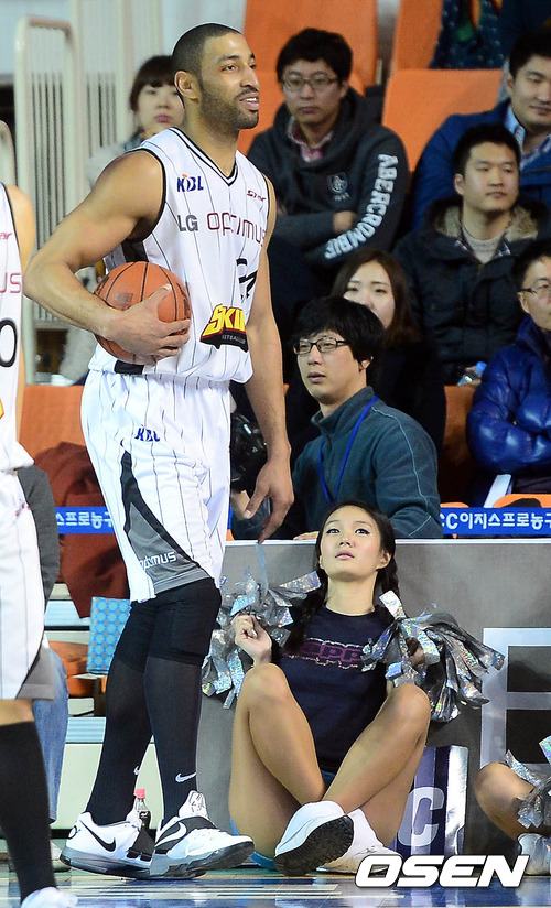 8일 오후 전주 실내체육관에서 열린 'KB 국민카드 2012-2013 프로농구' 전주 KCC와 창원 LG의 경기 4쿼터 클라크가 치어리더쪽으로 다가가자 치어리더가 뒤로 물러나고 있다.