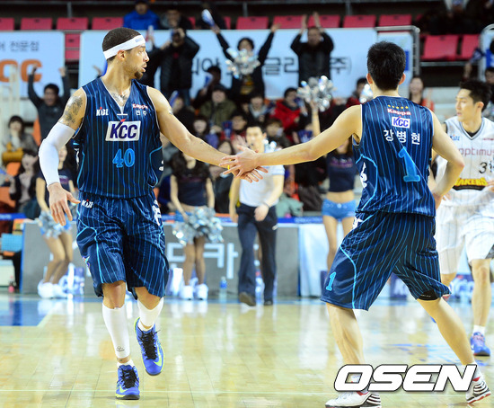 8일 오후 전주 실내체육관에서 열린 'KB 국민카드 2012-2013 프로농구' 전주 KCC와 창원 LG의 경기 4쿼터 강병현이 슛을 성공시킨 후 브라운과 하이파이브를 하고 있다.