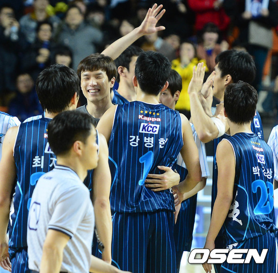8일 오후 전주 실내체육관에서 열린 'KB 국민카드 2012-2013 프로농구' 전주 KCC와 창원 LG의 경기 종료 후 KCC 선수들이 승리를 기뻐하고 있다.