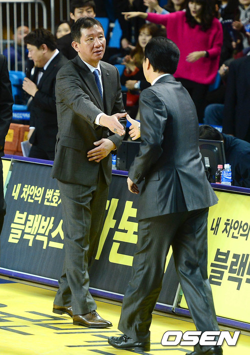 8일 오후 전주 실내체육관에서 열린 'KB 국민카드 2012-2013 프로농구' 전주 KCC와 창원 LG의 경기 종료 후 허재 감독과 김진 감독이 악수를 나누고 있다.