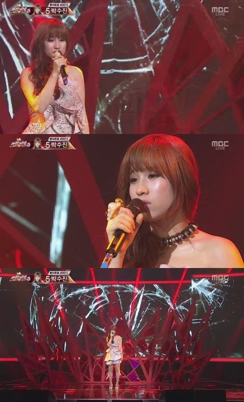 한껏 여성미를 강조한 드레스를 입고 무대에 오른 박수진은 백지영 못지않은 애절함으로 시청자들의 가슴을 움직였다.