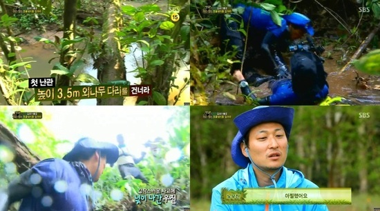 8일 오후 방송된 SBS 예능프로그램 '정글의 법칙 IN 아마존(이하 '정글')'에서는 3M 높이의 외나무 다리를 건너다 제작진과 함께 밑으로 떨어지는 노우진의 모습이 전파를 탔다.