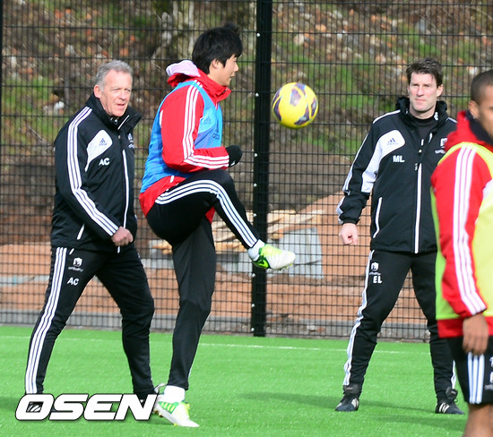 경기를 하루 앞둔 8일 오후(한국시간)스완지시티의 기성용이 라우드럽 감독(오른쪽)과 패싱 훈련을 하고 있다./ spjj@osen.co.kr