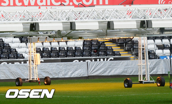 경기를 하루 앞둔 8일 오후(한국시간) 리버티 스타디움에 잔디를 살리는 기계가 작동되고 있다./ spjj@osen.co.kr