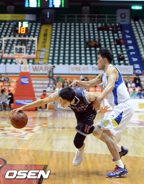 9일 오후 부산 사직실내체육관에서 열린 'KB 국민카드 2012-2013 프로농구' 부산KT와 서울 삼성의 경기, 1쿼터 KT조성민이 삼성 차재영의 수비에 걸려 넘어지고 있다.