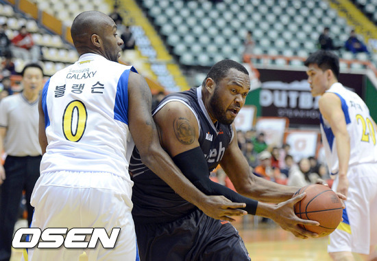 9일 오후 부산 사직실내체육관에서 열린 'KB 국민카드 2012-2013 프로농구' 부산KT와 서울 삼성의 경기, 1쿼터 KT 존슨이 삼성 블랭슨의 수비를 제치고 골밑 돌파를 하고 있다.