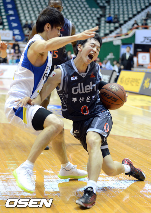 9일 오후 부산 사직실내체육관에서 열린 'KB 국민카드 2012-2013 프로농구' 부산KT와 서울 삼성의 경기, 2쿼터 KT김명진이 삼성 이시준의 수비에 걸려 넘어지고 있다.