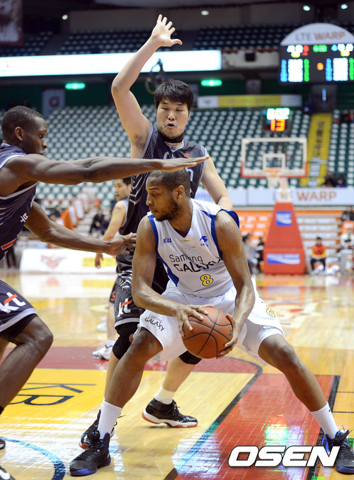 9일 오후 부산 사직실내체육관에서 열린 'KB 국민카드 2012-2013 프로농구' 부산KT와 서울 삼성의 경기, 3쿼터 삼성 타운스가 KT의 수비를 뒤로한채 골밑 돌파를 시도하고 있다.