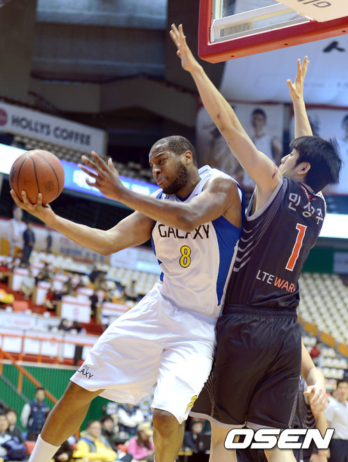 9일 오후 부산 사직실내체육관에서 열린 'KB 국민카드 2012-2013 프로농구' 부산KT와 서울 삼성의 경기, 3쿼터 삼성 타운스와 KT 민성주가 볼다툼을 하고 있다.
