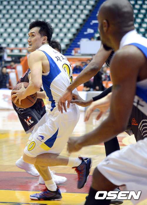 9일 오후 부산 사직실내체육관에서 열린 'KB 국민카드 2012-2013 프로농구' 부산KT와 서울 삼성의 경기, 4쿼터 삼성 차재영이 KT 수비를 뒤로한채 골밑 돌파를 하고 있다.