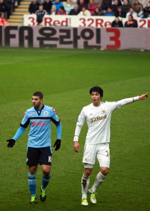 기성용이 아델 타랍을 마크하고 있다. 한편 이날 경기서는 넥슨의 FIFA 온라인 3 VVIP 투어로 경기장을 찾은 유저들이 스완지 시티와 QPR의 경기를 관전했다.