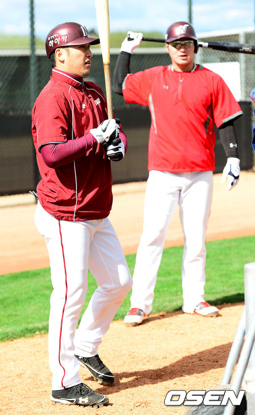 넥센 박병호와 이택근이 타격 훈련에 앞서 배트를 들고 몸을 풀고 있다