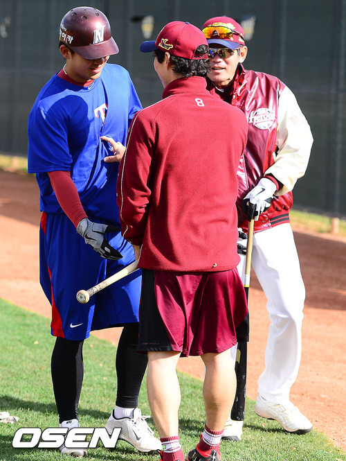 텍사스 레인저스 훈련복 입은 김민성이 정수성과 이야기를 나누고 있다