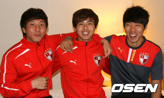 구정컵 2013 첫 경기 후 인터뷰 중인 윤성효 부산 감독(위), 부산 아이파크의 기대주로 주목받고 있는 박준강-정석화-이정기 신인 3인방(아래)