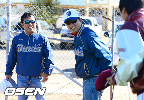 경기전 NC 이태일 사장과 김택진 구단주가 훈련장을 찾아 넥센 코칭스태프와 이야기를 나누고 있다 /soul1014@osen.co.kr