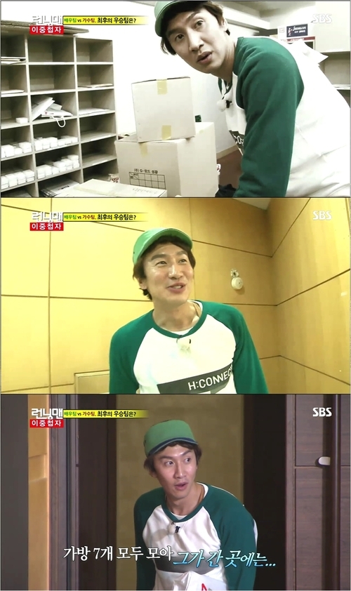 이광수는 지난 10일 방송된 SBS ‘일요일이 좋다-런닝맨’에서 황정민, 유재석, 박성웅, 송지효 등과 함께 배우팀에 속해 김종국, 지석진, 하하, 포미닛 현아, 개리 등의 가수팀을 이기고 우승을 차지했다. 이날 대결은 각 팀의 스파이인 송지효와 개리의 방해를 뚫고 총 7개의 가방을 먼저 차지하는 팀이 승리하는 방식이었다.