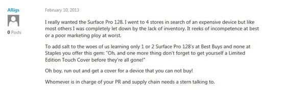 MS 공식 블로그서 한 네티즌은 “’서피스 프로’가 판매되는 모든 가게를 방문했지만 128GB 버전은 손에 넣을 수 없었다”며 “MS 당신들은 뭐가 문제냐”고 불만을 토로했다. 그는 지역의 스테이플스와 베스트 바이를 찾았지만 두 곳 모두 64GB 두 대를 보유하고 있었는데 이마저도 오전 9시 15분, 11시 15분에 판매가 끝났고, 128GB는 없었다고 전했다.