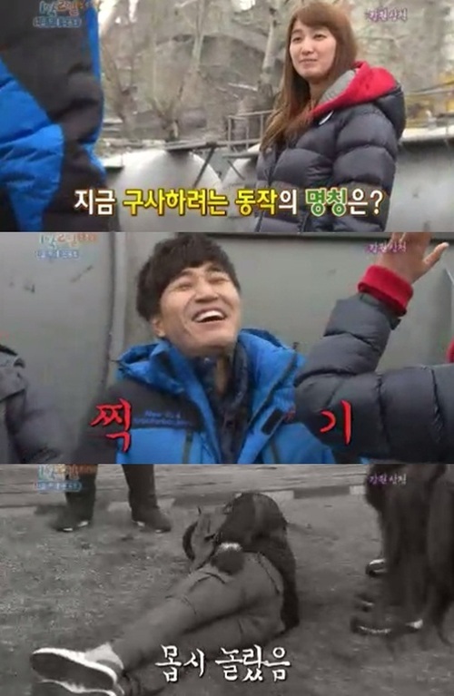 ‘1박 2일’ 김종민이 황경선의 발차기에 놀라 바닥에 누워 버렸다.