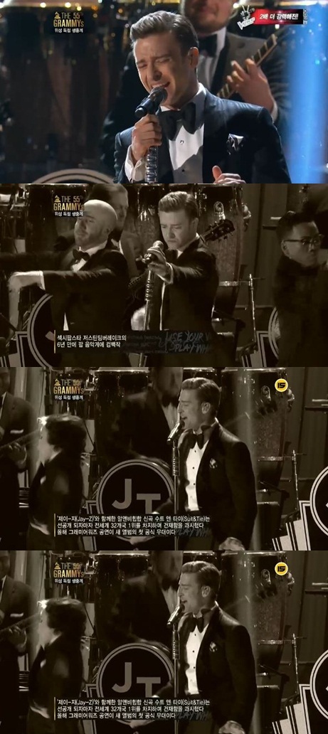 저스틴 팀버레이크는 11일(한국 시간) 오전 10시 엠넷을 통해 방송된 제 55회 그래미 어워즈에서 곡 '수트 & 타이(suit&tie)'와 '푸셔 러브 걸(Pusher Love Girl)'을 열창했다.