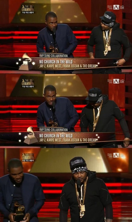 이들은 11일(한국 시간) 오전 10시 엠넷을 통해 방송된 제 55회 그래미 어워즈에서 곡 '노 처치 인 더 와일드(no church in the wild)'로 랩송 콜라보레이션(Rap song collaboration)상을 수상했다.