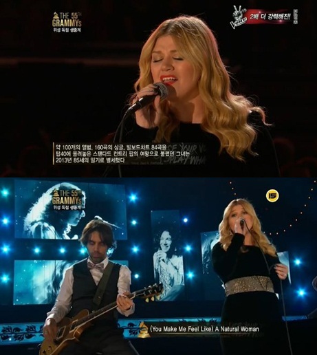 캘리 클락슨은 11일(한국 시간) 오전 10시 엠넷을 통해 방송된 제 55회 그래미 어워즈에서 아레나 프랭클린의 곡 '어 네츄럴 우먼(You Make Me Feel Like) A Natural Woman' 등 명곡을 열창했다.