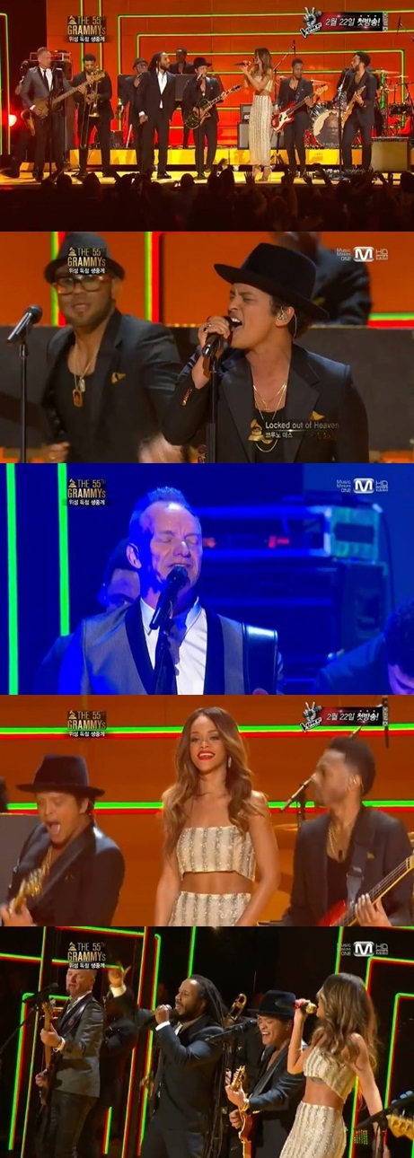 이들은 11일(한국 시간) 오전 10시 엠넷을 통해 방송된 제 55회 그래미 어워즈에서 브루노 마스 곡 '록트 아웃 오브 헤븐(locked out of heaven)'과 밥 말리의 곡 '쿠드 유 비 러브드(Could You Be Loved)'를 열창했다.