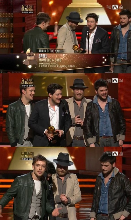 멈포드 앤 선즈는 11일(한국 시간) 오전 10시 엠넷을 통해 방송된 제 55회 그래미 어워즈에서 곡 '바벨(Babel)'로 올해의 앨범상을 거머쥐었다.