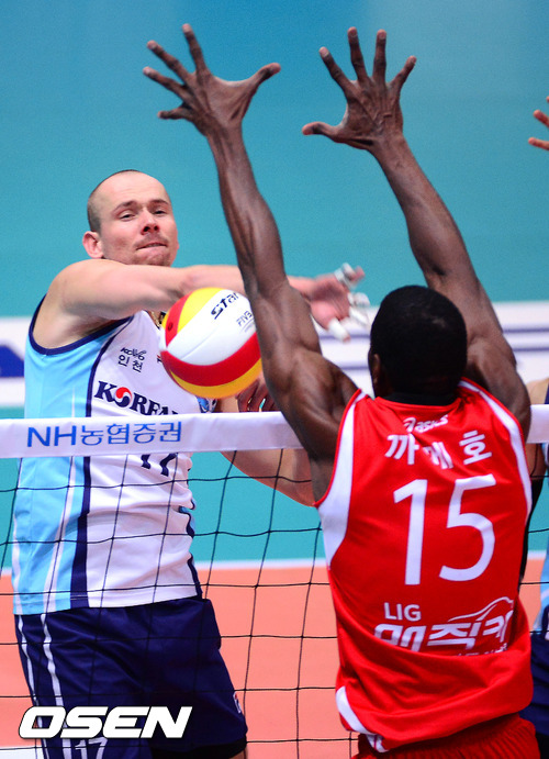 11일 오후 인천 도원체육관에서 열린 '2012-2013 NH농협 V-리그' 남자부 대한항공과 LIG손해보험의 경기, 1세트 대한항공 마틴이 LIG 까메호의 블로킹을 피해 스파이크를 때리고 있다.