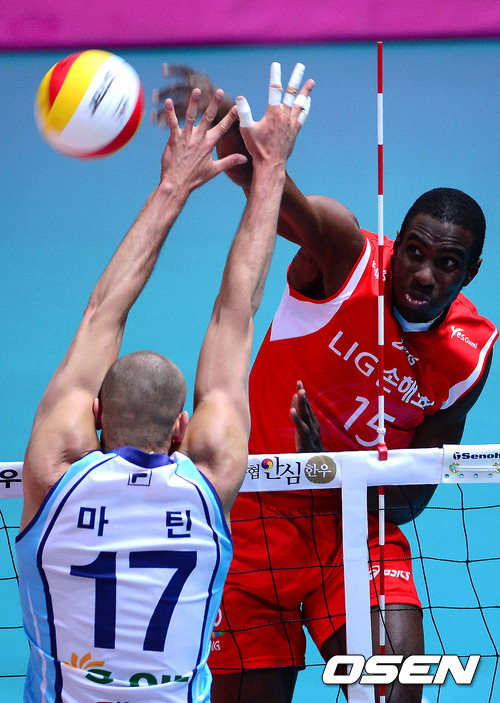 11일 오후 인천 도원체육관에서 열린 '2012-2013 NH농협 V-리그' 남자부 대한항공과 LIG손해보험의 경기, 2세트 LIG 까메호가 대한항공 마틴을 앞에두고 스파이크를 때리고 있다.