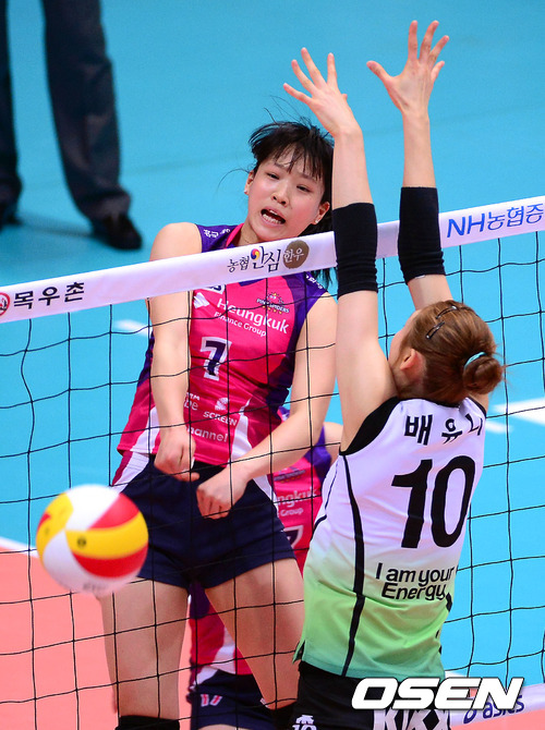 11일 오후 인천 도원체육관에서 열린 '2012-2013 NH농협 V-리그' 여자부 흥국생명과 GS칼텍스의 경기, 2세트 흥국생명 김혜진이 속공을 시도하고 있다.